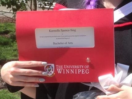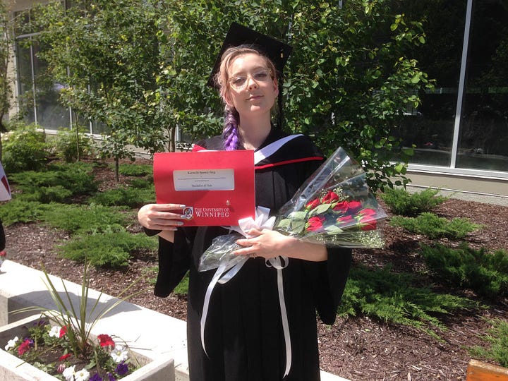 Two years earlier in 2016, I graduated with a Bachelor of Arts in Theatre at the University of Winnipeg. To the graduation ceremony, I wore a hair extension I dyed purple and braided to the side, plus false lashes and freshly minted grey gel nails with rhinestones on them.