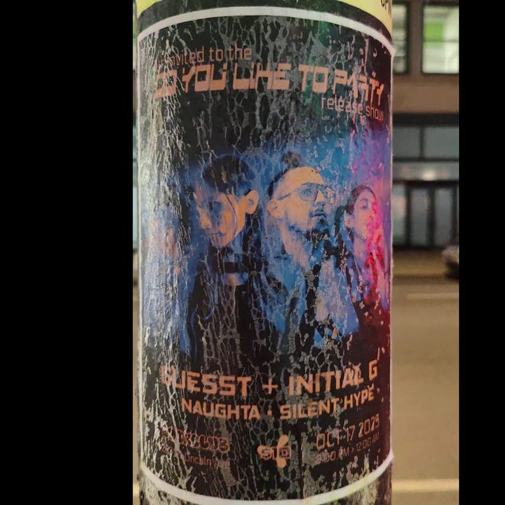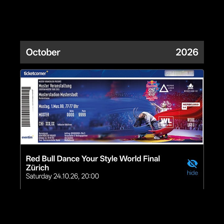 The Effect, Deltron 3030 (x2), Primary Trust, Two Gents, poster for Do You Like to Party album release, ticket to Red Bull Dance Battle 2026 in Switzerland...